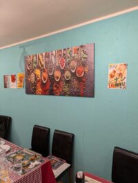 壁に飾られたスパイスの写真が印象的です。